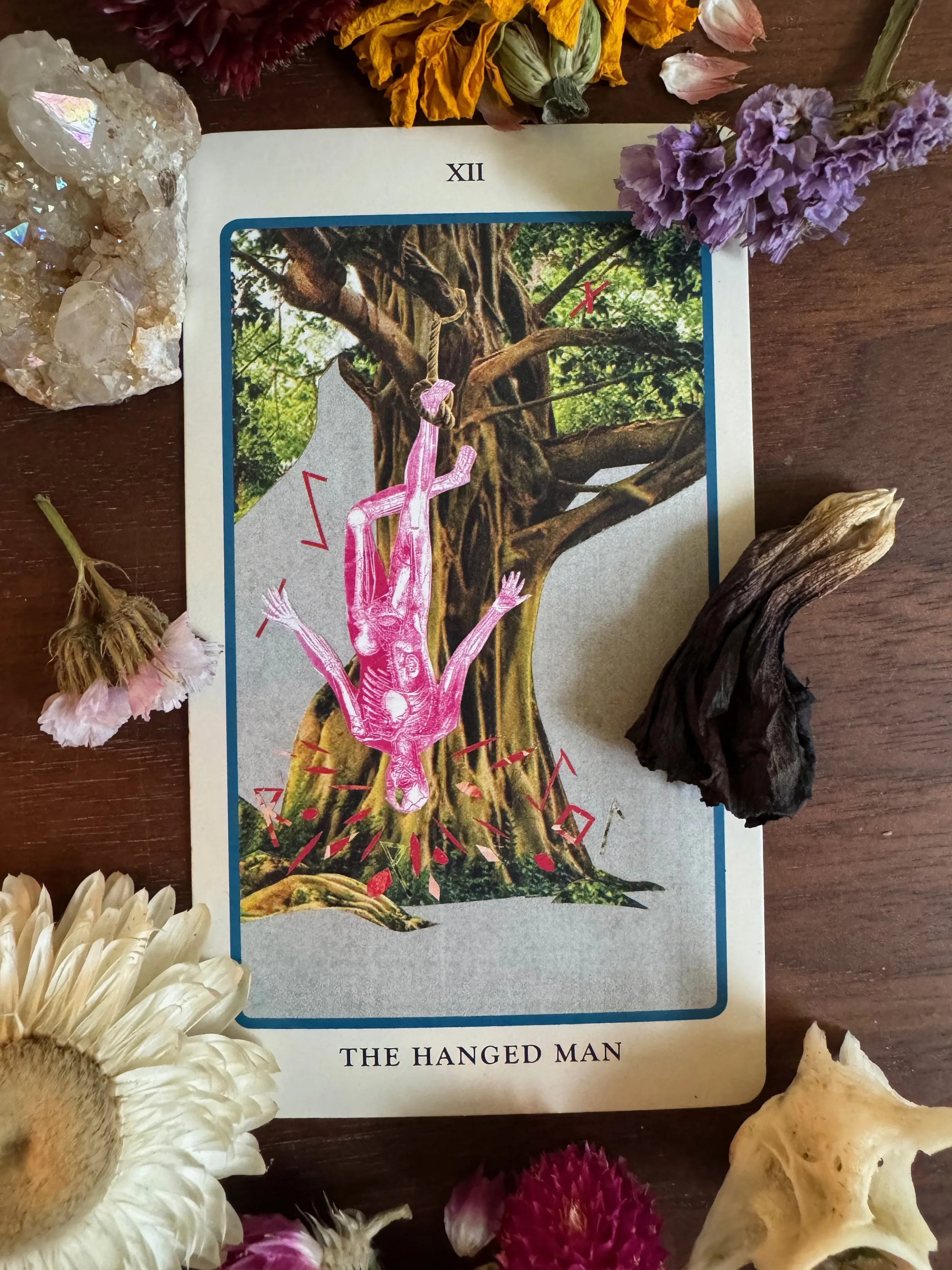 Winter naturally brings constraint, teaching us how to ration and stretch our resources. The symbol of Capricorn, the sign that brings winter to the northern hemisphere, is the sea goat, a mythical creature. A goat subsists in the terrain of constraint, on hardscrabble cliff sides and mountain tops. And what about the sea goat? In the tarot, water often symbolizes the entry to our inner depths. Aligned to the dark days of winter this side of the Earth, the sea goat becomes our guide to surviving the cold darkness by finding sustenance in the depths of our interiority. It makes me think of the tarot’s Hanged Man, whose halo in the classic Smith-Waite deck belies an inner peace, despite being strung up, trapped, constrained, if you will.