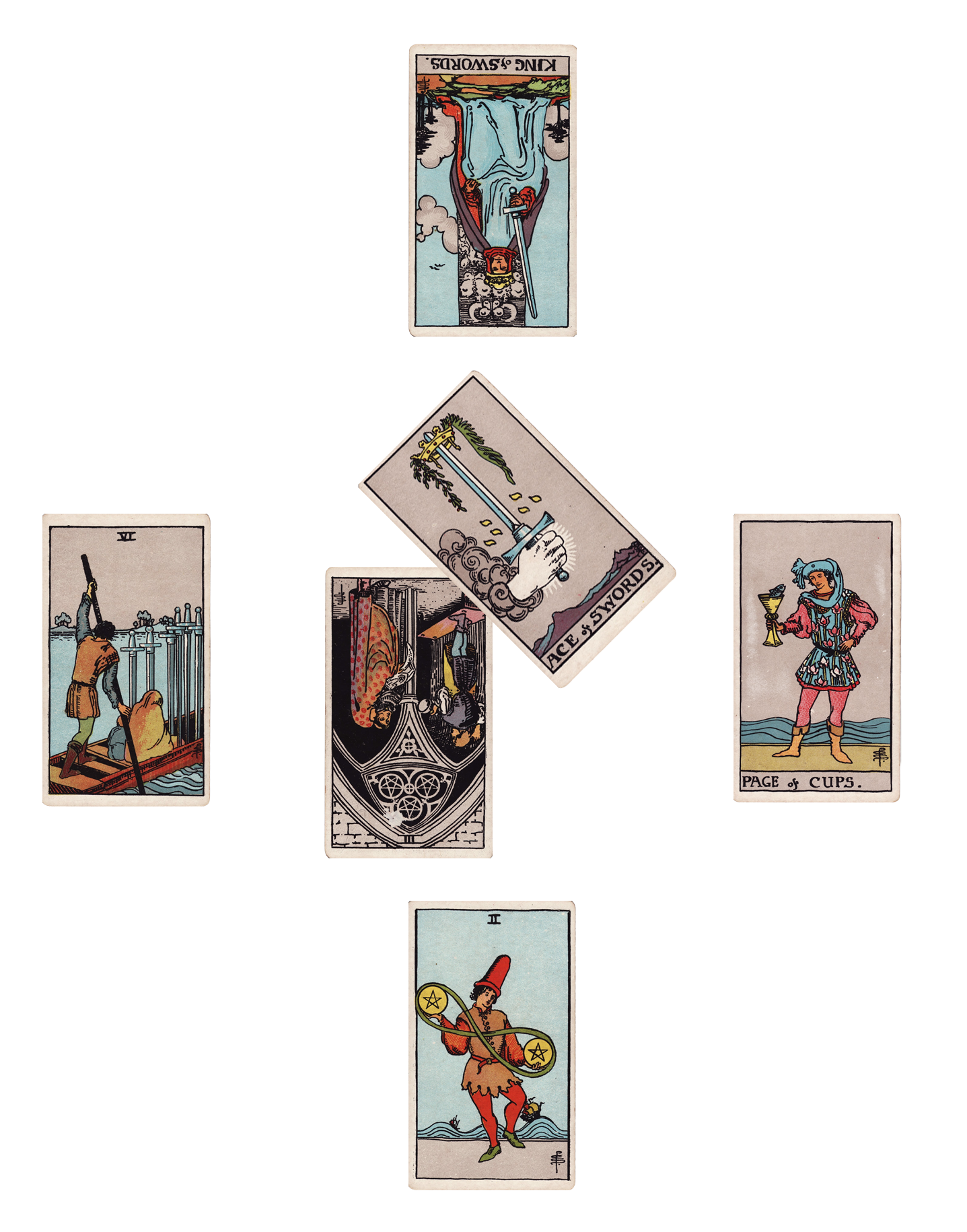 3 of Discs Rx, crossed by Ace of Swords, surrounding by 2 of Discs (below), 6 of Swords (left), Page of Cups (right), King of Swords Rx (top)